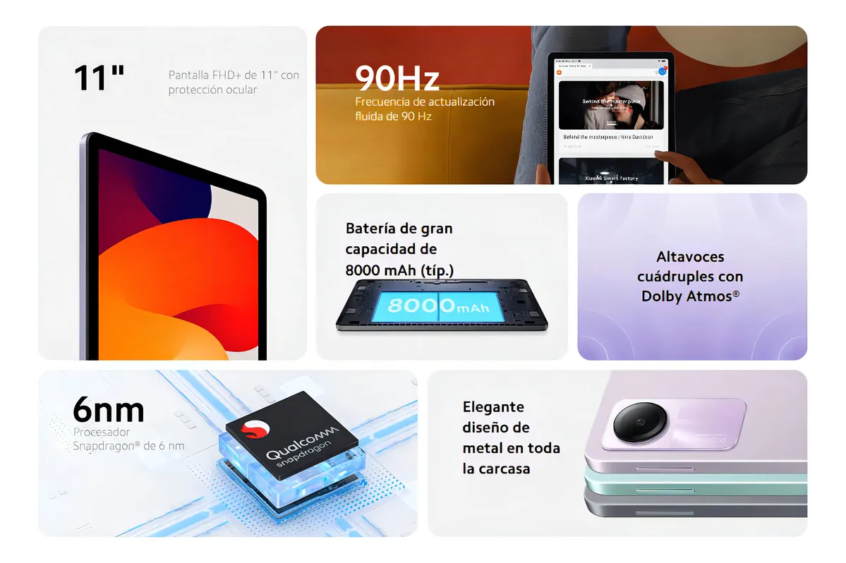 Pantalla FHD+ de 11″Resolución: 1920 x 1200, 207 pppFrecuencia de actualización: hasta 90 HzBrillo: 400 nits (típ.)Certificación de luz azul de baja intensidad TÜV Rheinland (solución de software)Certificación sin parpadeos de TÜV RheinlandVelocidad de muestreo táctil: hasta 180 HzRelación pantalla-cuerpo: 84,4 %Relación de contraste: 1500:1Gama de colores: 70 % NTSCProfundidad del color: 8 bits, 16,7 millones de colores* El tamaño de la pantalla de Redmi Pad SE es de aproximadamente 11” en el rectángulo completo cuando se mide en diagonal. El área visible real es menor debido al diseño de esquina curva. Las mediciones entre productos individuales pueden variar.